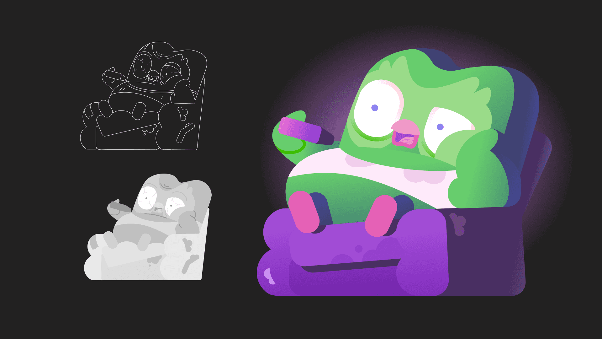 Working within Duolingo’s shape-driven style meant simplifying in a way that still felt expressive. The tricky part about “simplicity is key” is that nothing can hide — small inconsistencies become obvious fast. Balancing clarity while keeping the character’s personality intact required careful editing and a lot of attention to detail.